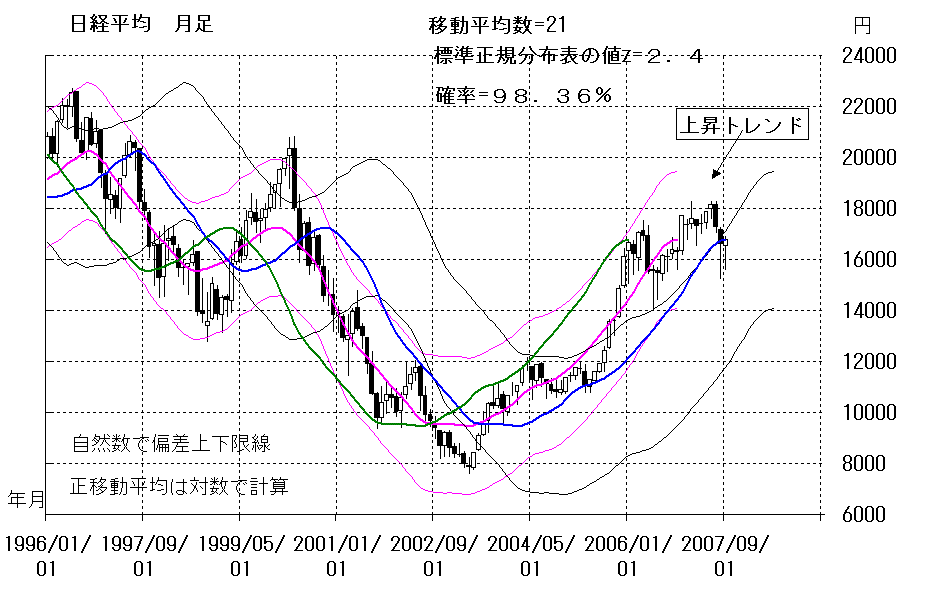 上の日経平均 月足のグラフの下降トレンドで2008年1月から現時点の2009年3月までの移動平均数は15と安定してます。