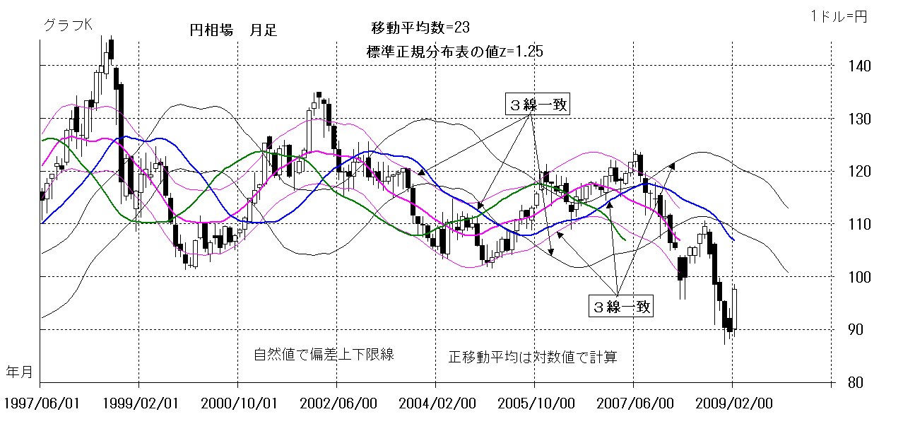 グラフKでは2005年10月前後の上昇トレンドとその前の下降トレンドに3線一致があります。